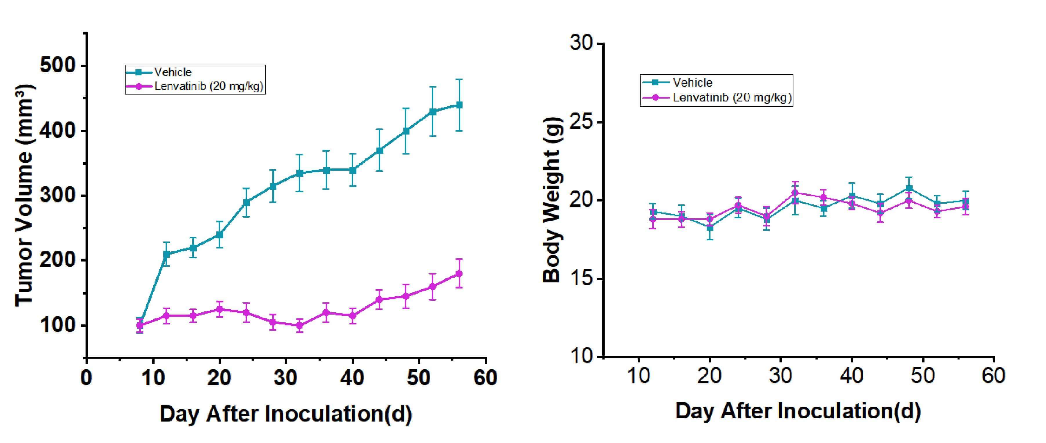 The tumorigenicity utility of the RT-4 cell line was validated through establishment of a subcutaneous xenograft model in immunodeficient C-NKG mice. RT-4 cells (5×106 cells/mouse) were inoculated into 7-week-old mice, with tumors reaching approximately 90 mm³ by day 8 post-inoculation, at which point animals were randomized into treatment groups. Mice received either vehicle control or Lenvatinib (20 mg/kg, oral gavage, once daily) for 7 weeks. Lenvatinib is an oral multi-kinase inhibitor that selectively inhibits VEGF receptors and other oncogenic signaling pathways