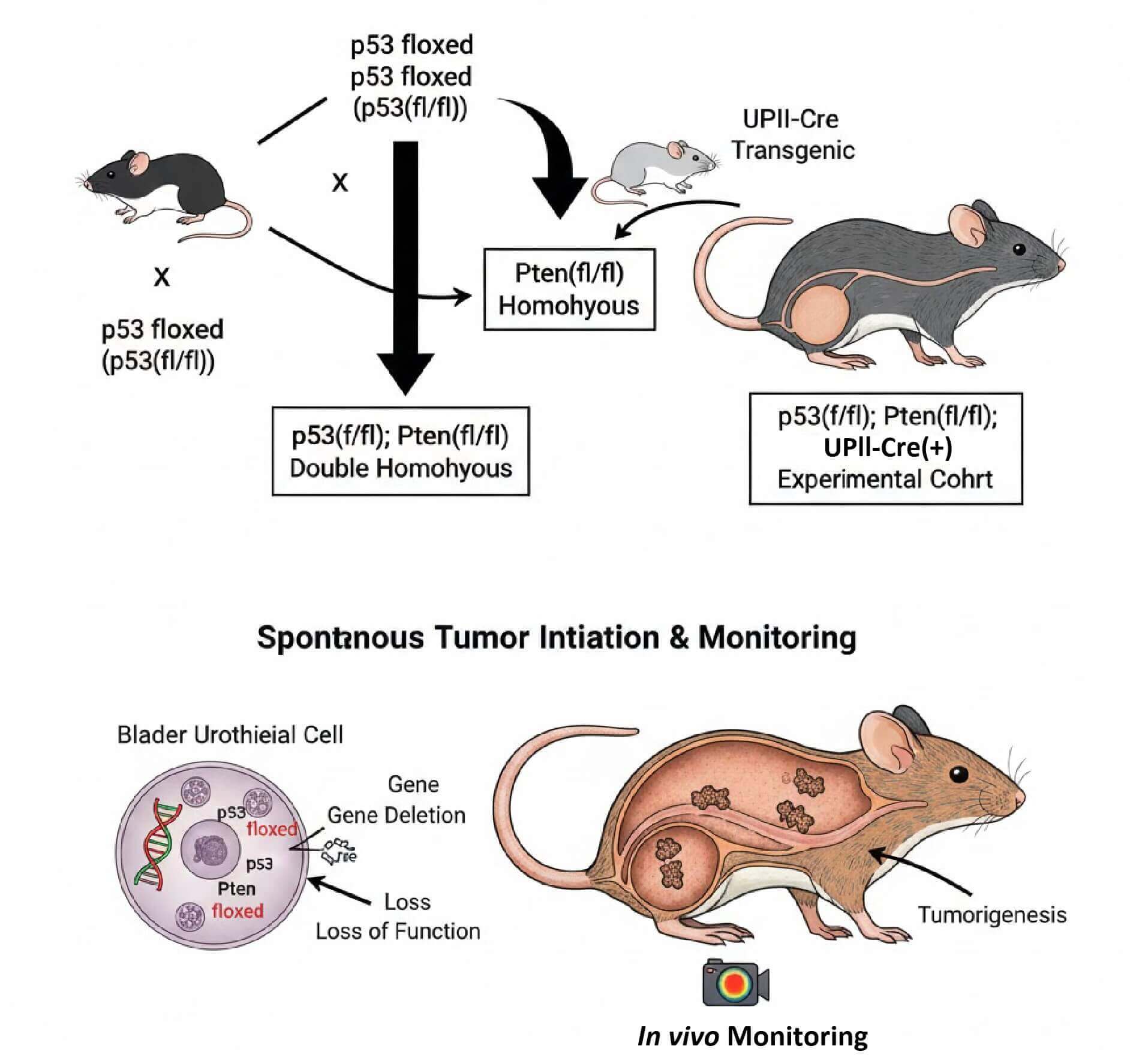 Widely available B6.129P2-Trp53(tm1Brn) (p53 floxed) mice are crossed with B6.129S4-Pten(tm1Hwu) (Pten floxed) mice to generate p53(fl/fl); Pten(fl/fl) double homozygous mice. These are then bred with UPII-Cre transgenic mice to ultimately produce the experimental cohort: p53(fl/fl); Pten(fl/fl); UPII-Cre(+) mice.