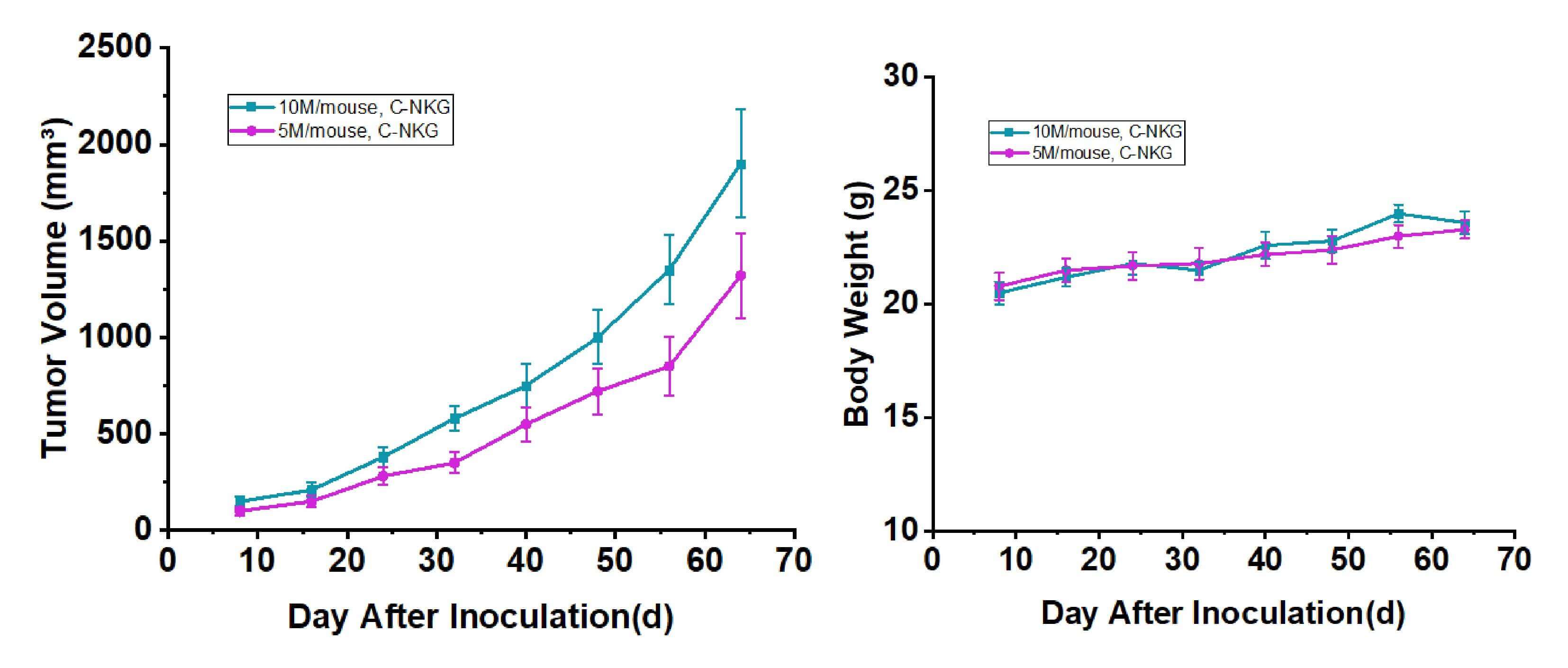 Fig. 2 Tumor volume and body weight growth curve of bladder cancer 5637 cell line subcutaneous implantation (n=6). Data are presented as mean ± standard error (SEM). (Source: Alfa Cytology)