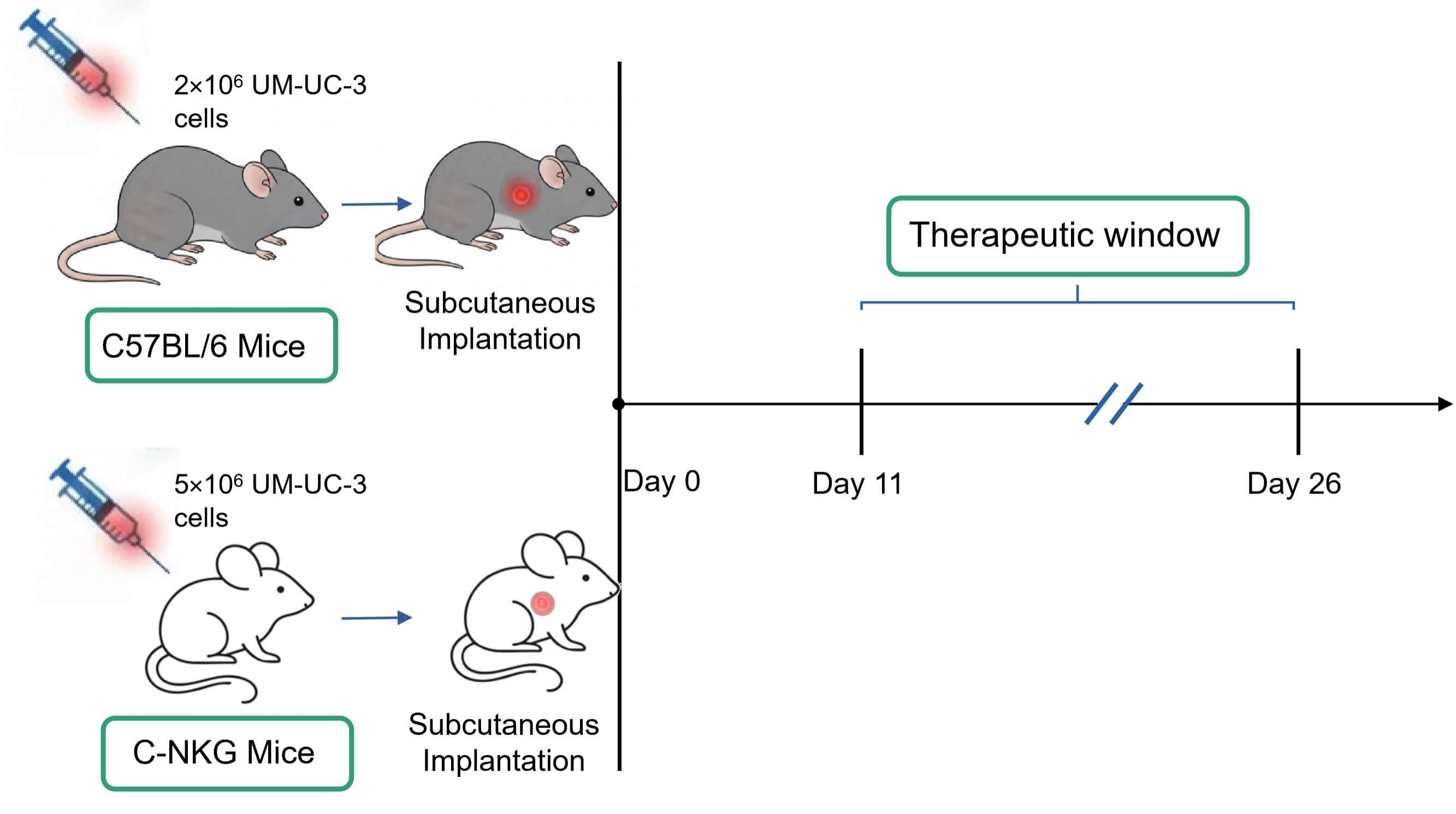 The model was established by subcutaneously implanting human UM-UC-3 bladder cancer cells into mice. Tumor growth is monitored regularly by caliper measurements to track progression. Cell inoculum is 5×106 cells/mouse (C-NKG) or 2×106 cells/mouse (BALB/c).
