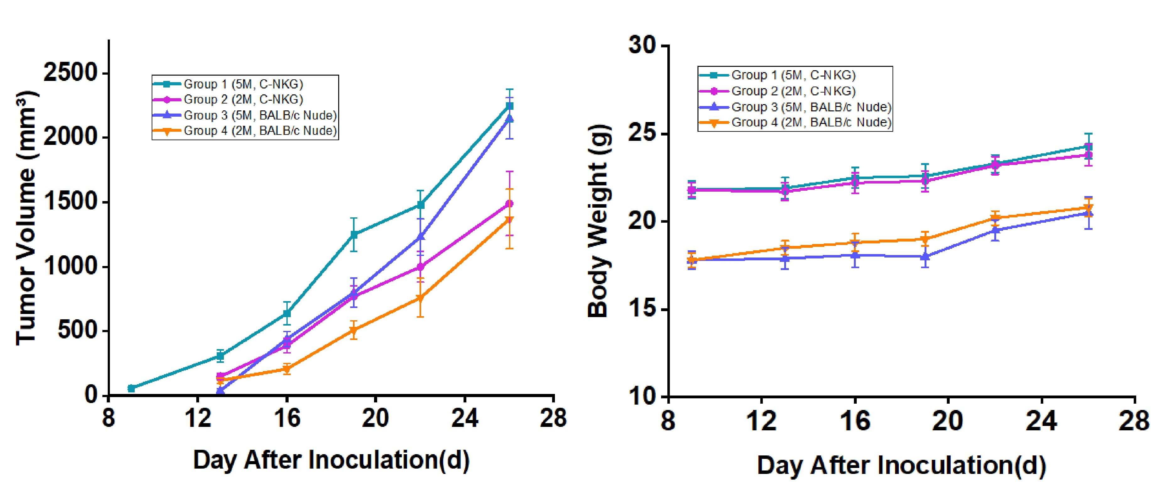 Fig. 2 Growth curves of UM-UC-3 subcutaneous xenograft tumors and mouse body weight in C-NKG and BALB/c mice (n=6). Data are expressed as mean ± SEM. (Source: Alfa Cytology)
