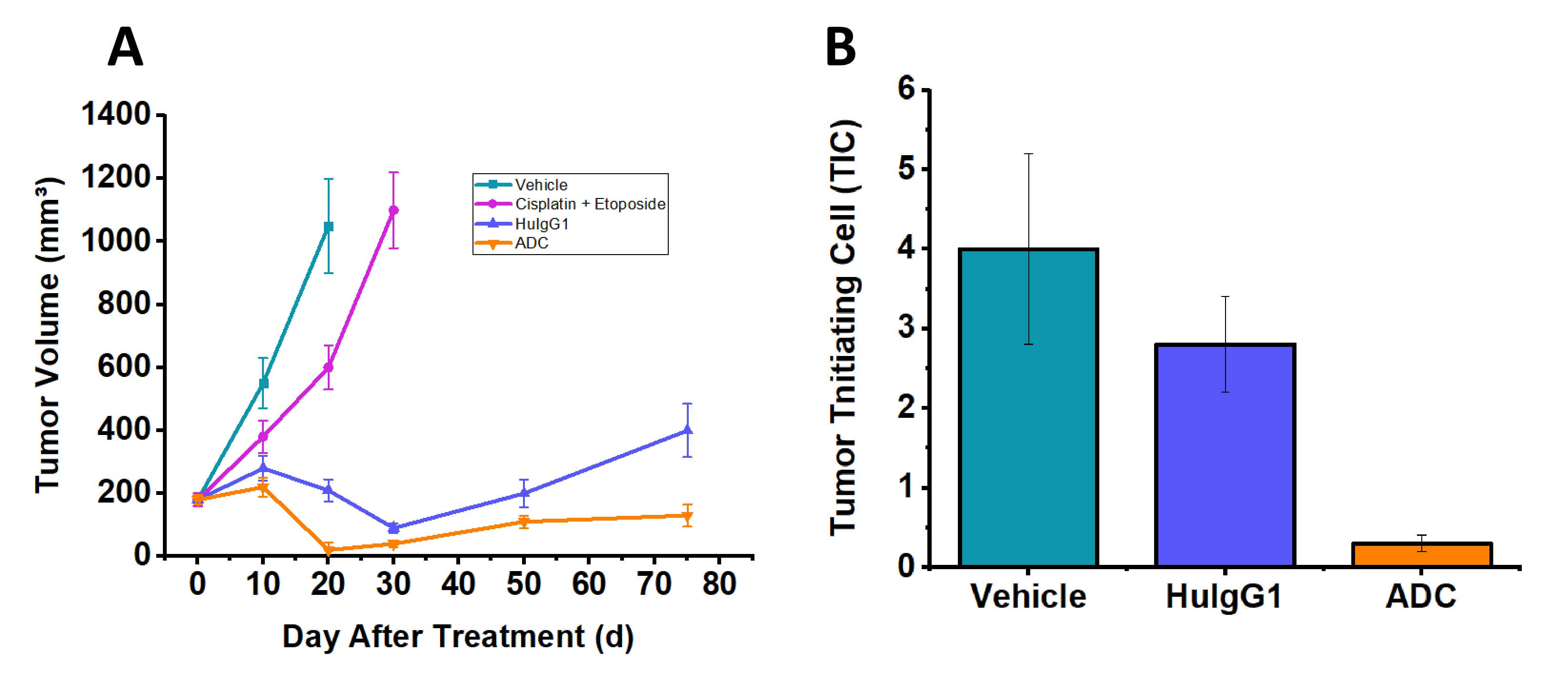 Fig. 2 ADC anti-tumor efficacy in the SCBC PDX model. (A) Tumor volume. (B) Residual tumor initiating cell (TIC) frequency. Data are presented as mean ± SEM. (Source: Alfa Cytology)