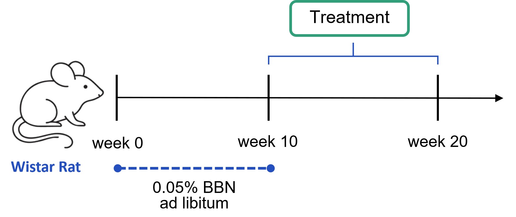 Male Wistar rats were maintained under specific pathogen-free (SPF) conditions. Bladder cancer was induced by administering 0.05% BBN in drinking water ad libitum for 10 weeks. After carcinogen exposure, the rats were treated with different concentrations of compound A for 10 weeks. Bladders were harvested at endpoint for histopathological analysis.