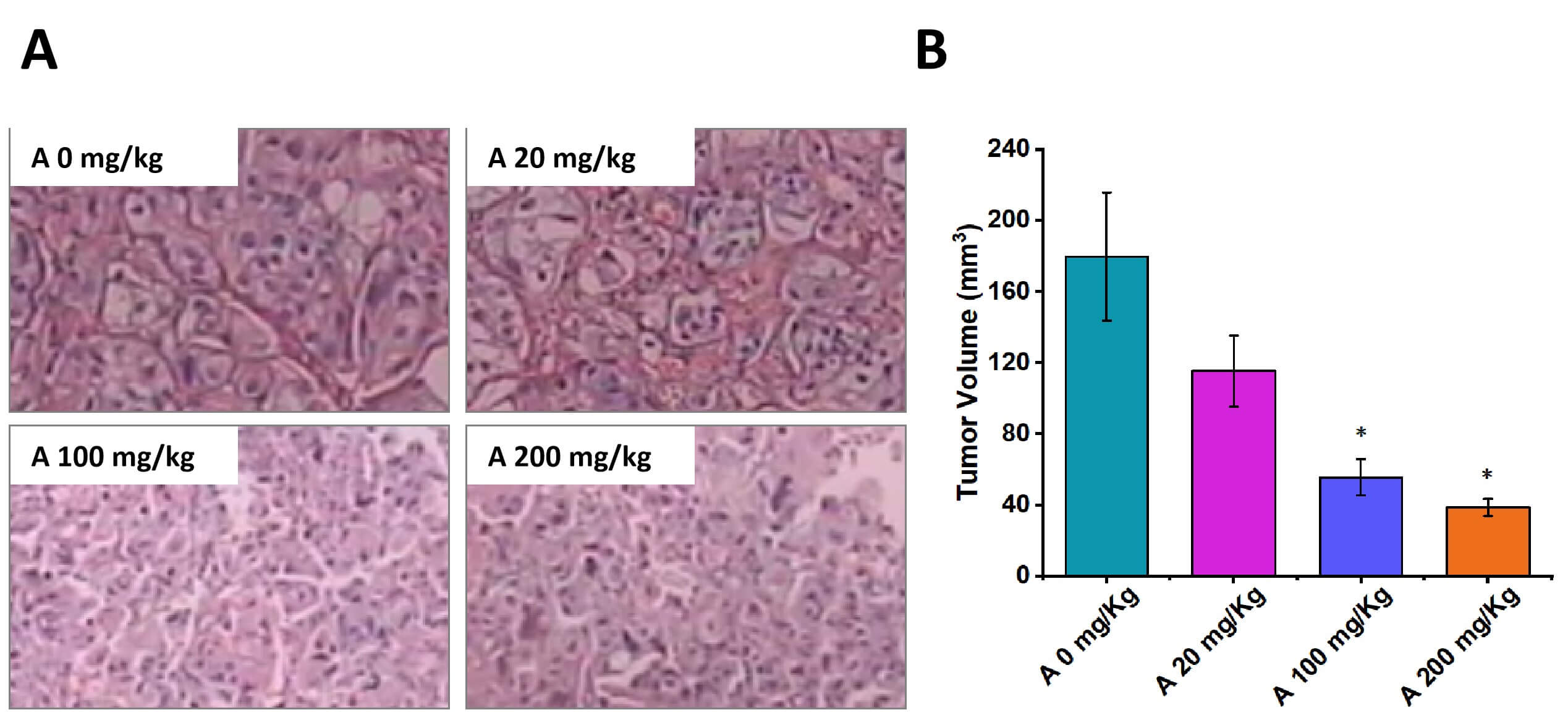 Fig. 3 Compound A dose-dependently inhibits bladder tumor growth in the BBN-induced rat model. (A) Representative H&E-stained bladder section. (B) Tumor volume. Data are presented as mean ± SEM. (Source: Alfa Cytology)