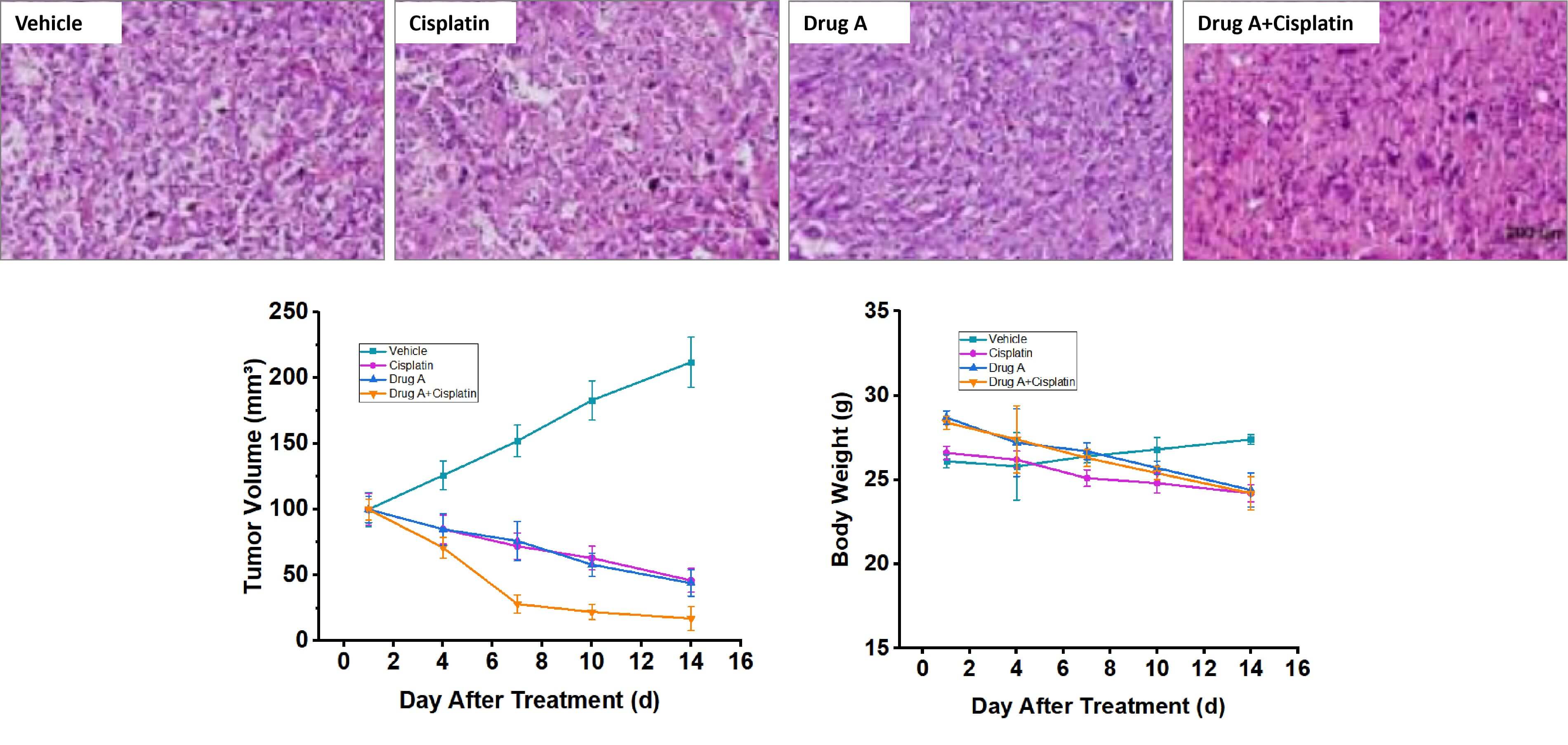 Fig. 3 Antitumor efficacy of drug A in the BFTC-909 xenograft model. (A) Tumor volume. (B) Body weights. (C) Representative tumor images. Data are presented as mean ± SEM. (Source: Alfa Cytology)