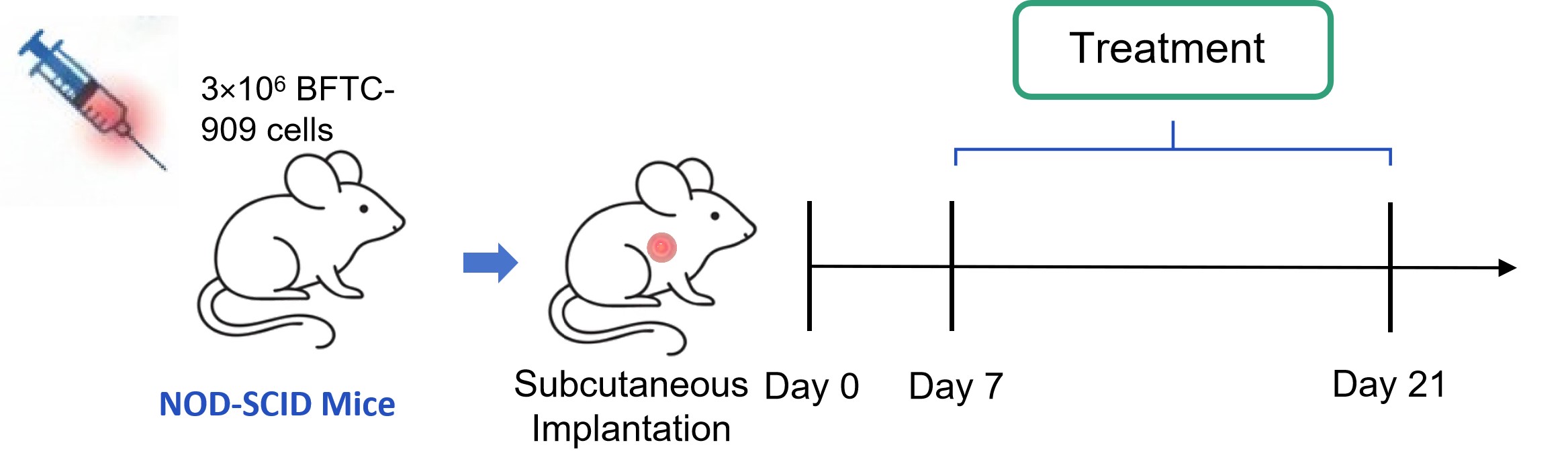 3 × 106 BFTC-909 cells were subcutaneously inoculated into NOD-SCID mice. Tumor growth was monitored, and when volumes reached 50-100 mm3, mice were randomized into treatment groups.